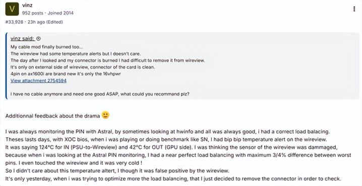Overclock.net超频论坛网友“Vinz”发扬了他的一段恶运际遇,已经和擢发可数的12V-2x6 16针供电接口沟通。