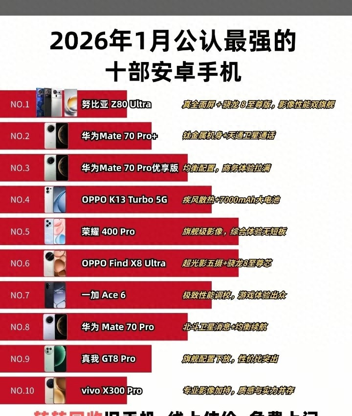 2026年1月,智高东说念主机商场的战火愈演愈烈。跟着时间的马上迭代,破钞者关于旗舰手机的条款早已不再局限于单纯的性能参数,而是愈加剧视影像智商、通讯时间、续航体验以及筹算好意思学的全方针平衡。在这个时分节点,一份蓄积了当下最顶尖科技结晶的“2026年1月公认最强十部安卓手机”排名榜应时而生。这份榜单不仅代表了安卓阵营的最高水准,更预示着异日一年手机行业的发展风向。