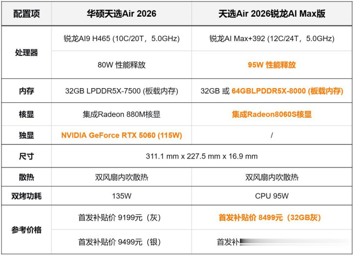 第一,华硕天选 Air 2026 锐龙AI9 H465 RTX 5060独显版块;