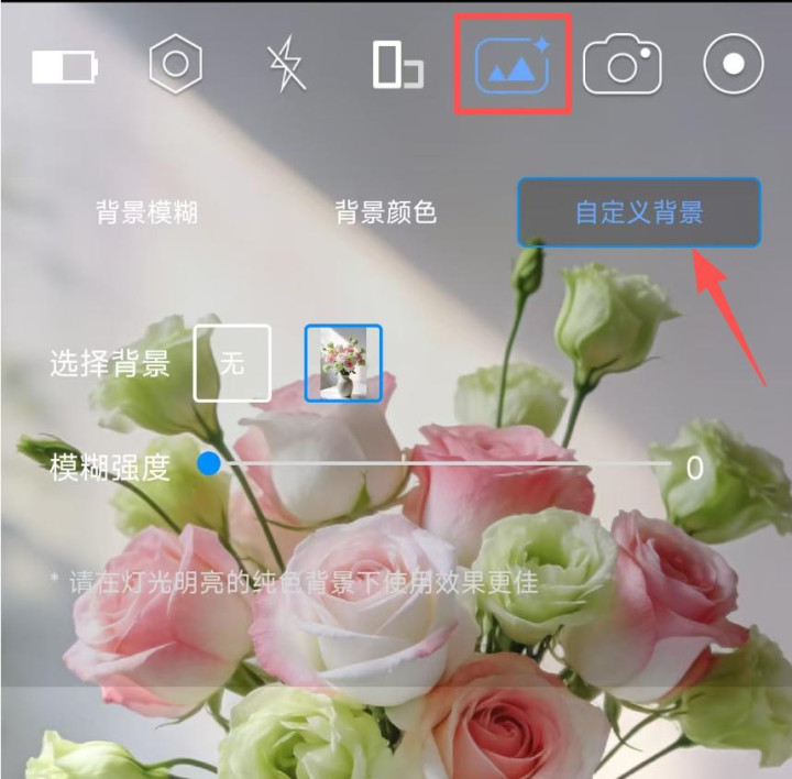 4、手机点击EV凭空录像头App上方的【图片】按钮,遴荐【自界说配景】不错添加手机图片。