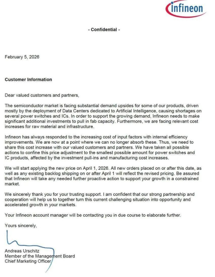 @QQ_Timmy发布了据称是英飞凌致客户的信件,奉告其多款电源开关和IC出现缺少并将加价。这封由首席营销官Andreas Urschitz签署的信件称,公司需要提前扩大产能以称心AI行业偏激他客户的需求,同期也正靠近原材料与基础门径资本的显赫上升。因此,公司不得不从2026年4月1日起调整其电源开关和IC的价钱。