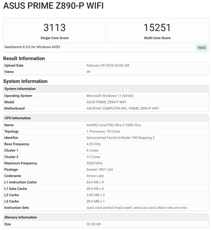 那在跑分平台的效果中表示,250K Plus在单核测试中得分为3113分,多核为15251分。从性能上来看比较现金的245K,在单核上进步略高于5%,可是多核得益不如245K(245K的多核跑分基本在17000-18000之间)。从证实上来说这个分数并不太正常,可能优化适配上还需要一定时间。