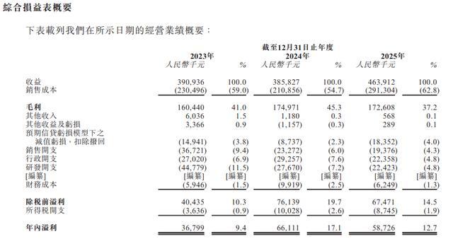 凭借公司的中枢AI本领、对欺诈范围的深切贯穿以及求实且高效的买卖化智商,公司已于往绩时代终了络续盈利。法度2023年、2024年及2025年12月31日止年度,公司的年内溢利离别为东说念主民币3680万元、东说念主民币6610万元及东说念主民币5870万元。法度2023年、2024年及2025年12月31日止年度,公司的年度经和谐纯利(非国外财务证明准则计量见解)离别为东说念主民币3680万元、东说念主民币6610万元及东说念主民币7600万元。2023年、2024年、2025年,公司毛利离别为1.6亿、1.75亿元、1.73亿元;毛利率离别为41%、45.3%、37.2%。