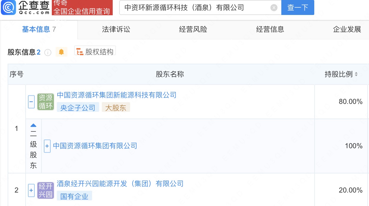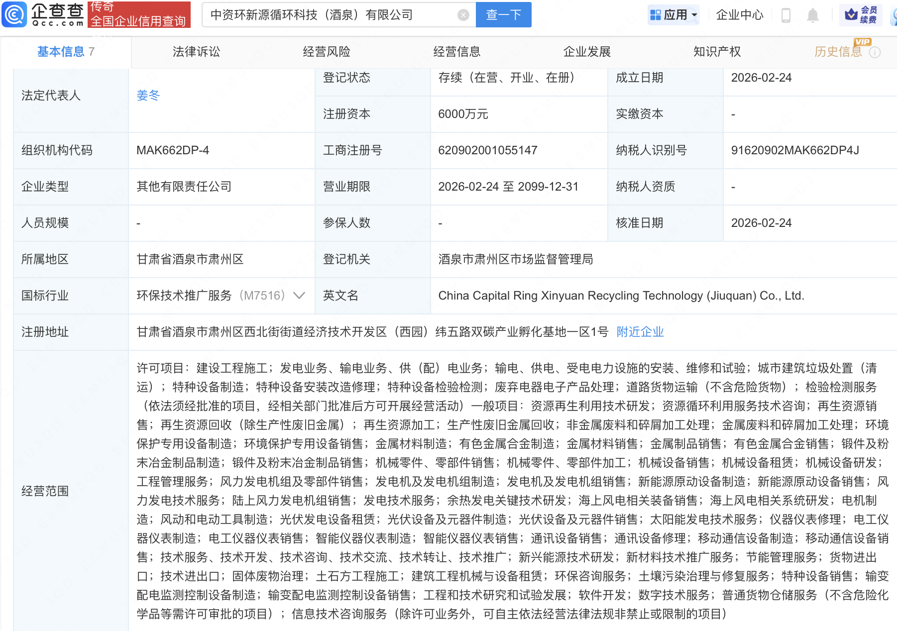 近日,中资环新源轮回科技(酒泉)有限公司成就,法定代表东说念主为姜冬,大发官方网站手机appMILAN SPORTS注册本钱6000万东说念主民币,目标领域包括竖立工程施工、特种劝诱制造、特种劝诱装配更始修理等。企查查股权穿流露出,该公司由中国资源轮回集团有限公司全资子公司中国资源轮回集团新动力科技有限公司等共同抓股。