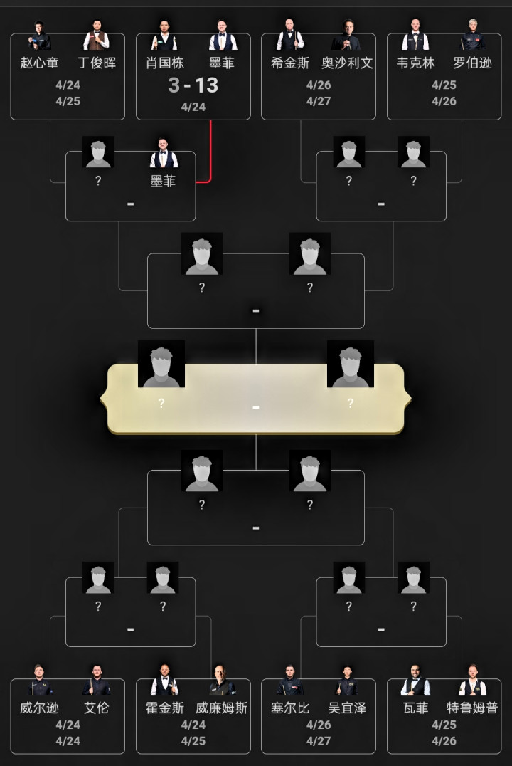 按照赛程来看,赵心童与丁俊晖的第3阶段比赛将在翌日进行。而在另外一场1/8决赛中,墨菲以13-3的比分校服了中国选手肖国栋,领先晋级到了8强之中,而他也将在1/4决赛中迎战赵心童和丁俊晖之间的胜者。