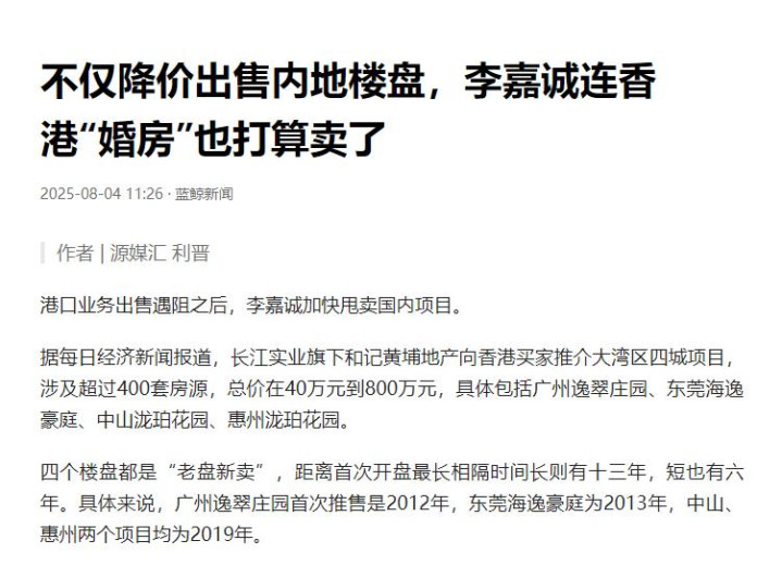 次年,李嘉诚又抛售了在上海和南京的中枢物业。