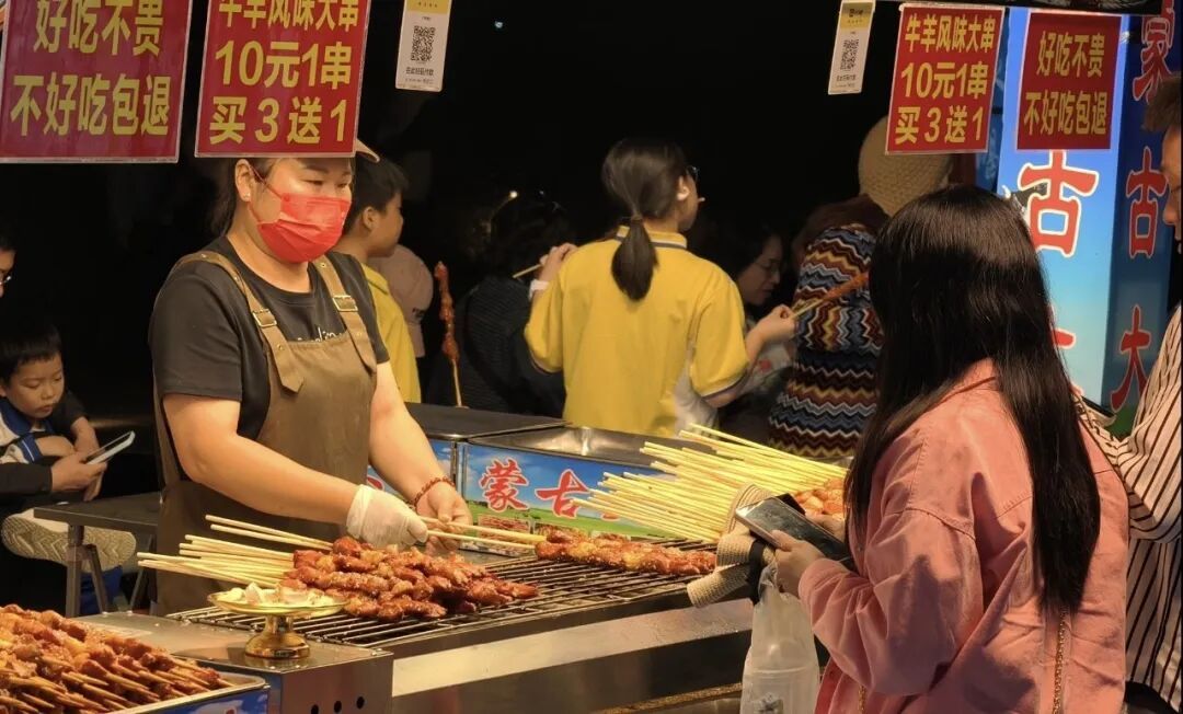 集市内香气四溢,烧烤、牛杂、钵仔糕、双皮奶等好意思食五花八门,门客们边逛边吃,脸上写满得志。