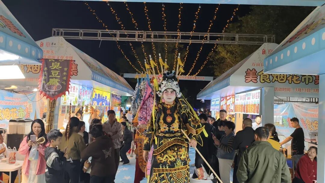 不远方,非遗踩高跷也在东谈主群中穿梭起舞。饰演者脚踩长木,身姿矫捷,时而排队行进,时而与搭客击掌互动,将传统风尚的激烈与活力带到搭客身边。