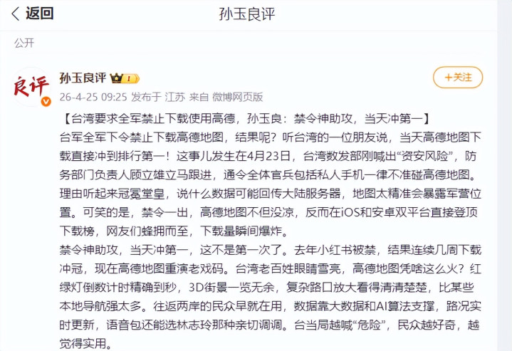 4月23日,台湾数发部刚喊出“资安风险”,防务部门认真东说念顾客立雄立马跟进,通饬举座官兵包括私东说念主手机一律不准碰高德舆图。事理听起来堂金冠冕,说什么数据可能回传大陆服务器,舆图太精确会显现军营位置。好笑的是,禁令一出,高德舆图不但没凉,反而在iOS和安卓双平台顺利登顶下载榜,网友们簇拥而至,下载量霎时爆炸。