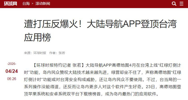 台军禁用高德舆图,却让它登顶下载榜,这场闹剧看似好笑,实则折射出长远的现实:大陆硬科技的崛起势不成挡,两岸民间雷同和会的潮水不成逆转,民进党“政事凌驾民生”的操弄注定失败。