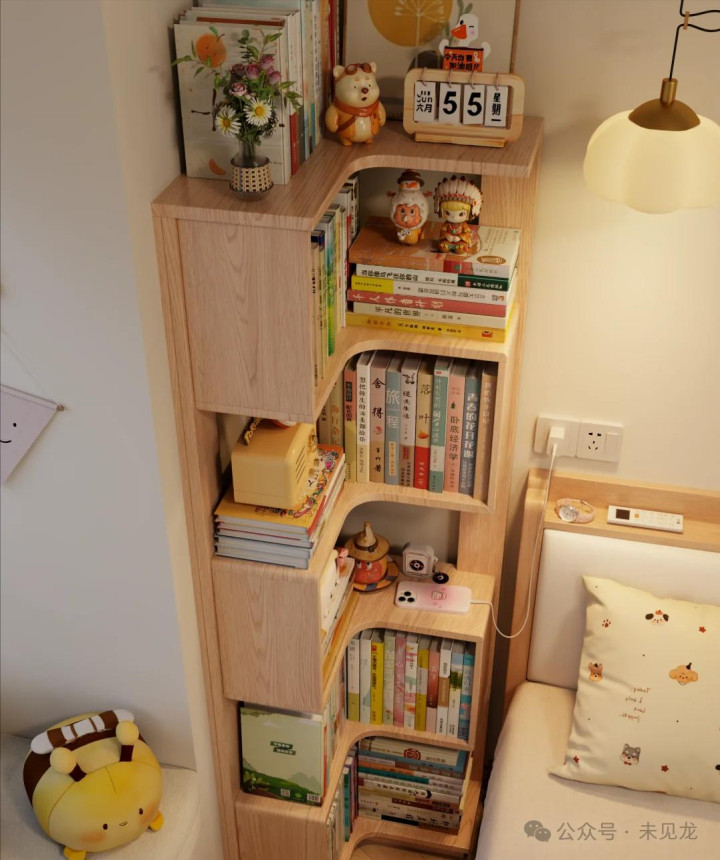 蓝本以为床头柜必不成少,用了一两年越看越占地。换成转角书架才发现,90°卡在墙角,书、手机、小夜灯一格一格摆着,比堆在床边地上省空间。夜里起来找东西,毋庸纪念踢着床头板。还有一层,有孩子的家,旯旮书架全体动听,也不怕磕碰出事故。