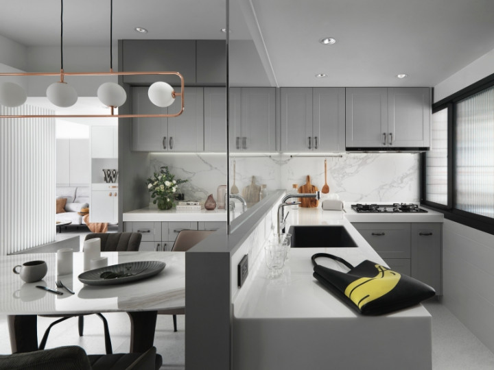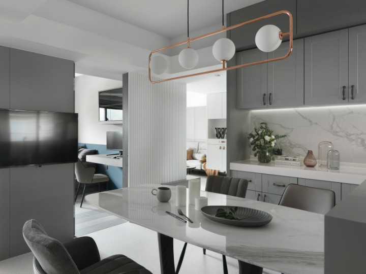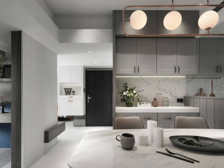 公领域以通透的界线重构餐厅、厨房与客厅之间的联系。半高墙聚积极简玻璃阻隔,让视野与色泽得以相接鞭策,并回答油烟窒碍的推行需求。雾灰色系橱柜与白色大理石纹墙面组成冷静布景,搭配金属框件与玫瑰金几何吊灯,酿成明确的视觉锚点;迤逦照明与柜体洗墙光的眉目建设,使合座光环境更趋近饭铺大家空间的细腻质感。