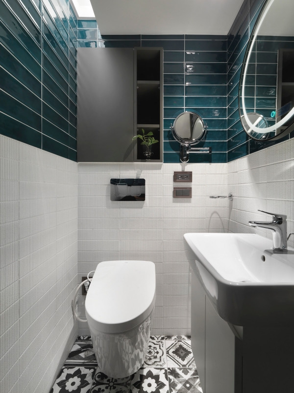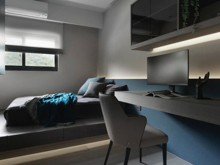 私领域则以色调行为心理叙事的革新。主卧透过干燥玫瑰粉软包、东谈主字拼木地板与柔光照明,营造包覆而从容的休憩氛围;次卧以蓝绿色调、铁件元素与架高地坪整合收纳机能,展现感性且随性的空间特性。卫浴空间斗胆哄骗水磨石、相沿花砖与孔雀蓝地铁砖进行异材质拼接,使闲居沐浴活动转移为具有典礼感的体验。