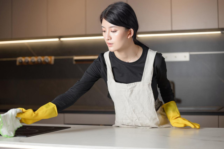 厨房台面光洁,但灶后墙面那些喷溅状深色油点,只是被稀释清洁剂擦淡,远谈不上"废除"。