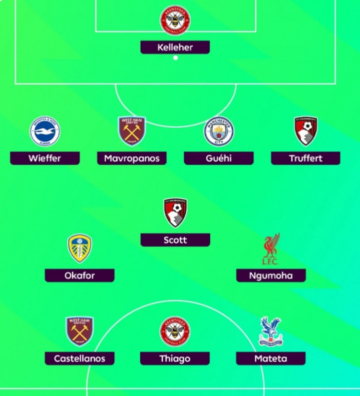 后卫:韦弗(布莱顿)、马夫罗帕诺斯(西汉姆联)、格伊(曼城)、特吕费尔(伯恩茅斯)