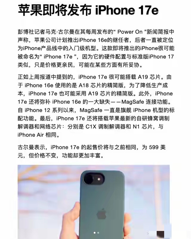 在智高手机商场趋于平静确当下,苹果的初学级家具线总能牵动无数用户的心。也曾以“廉价+老诡计”藏身的iPhone SE系列,凭借工致机身与强悍芯片成绩了一批诚恳粉丝,但也因续航拉胯、诡计老旧、功能缺失饱受诟病。近日,据彭博社马克·古尔曼、中关村在线等巨擘渠说念音书,苹果行将推出iPhone 17e,接替此前的iPhone 16e,成为全新初学机型。顶配芯片下放、订价亲民、MagSafe磁吸充电回首,一系列重磅升级,让这款被视为SE系列继任者的新机,澈底冲突了苹果初学机“挤牙膏”的固有印象。这场悄无声气的变革,不仅是家具的迭代,更是苹果对中端商场、对无为用户需求的全面修起,苹果SE系列确凿要变天了?