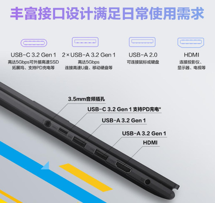 接口够丰富:3个USB-A+USB-C,无须带膨胀坞