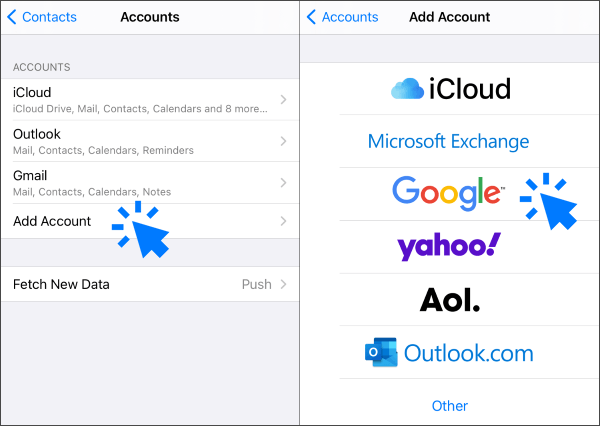 第 2 步。要是您尚未诞生 Gmail 帐户,请聘请“添加帐户”选项,点击“Google”选项,然后输入您的 Google 帐户证据。