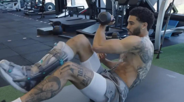 术后不到50天,还衣服厚厚保护靴的塔图姆,依然运行在队医的伴随下在健身房练力量了。